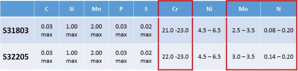 為了區(qū)分在成分范圍頂端生產(chǎn)的雙相不銹鋼,引入了一種新的規(guī)格,即UNS S32205。S32205(F60)材質(zhì)的雙相不銹鋼完全符合S31803(F51)的標題,反之則不然。因此,S32205可以雙重認證為S31803。