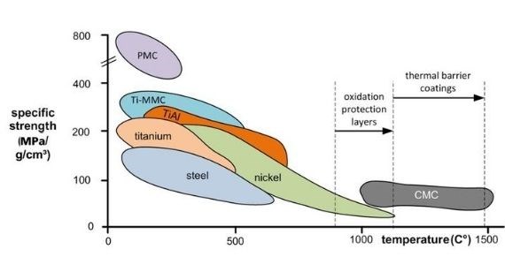 如上圖所示,就惡劣溫度環(huán)境下的性能而言,鎳基合金(如 Inconel 718)可以成為優(yōu)于鈦或鋼的合適材料。鎳基合金中的氧化保護(hù)層進(jìn)一步提高了機(jī)械性能。